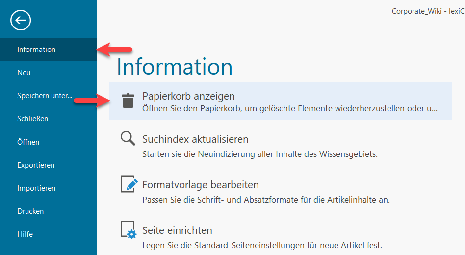 Um den Papierkorb öffnen und einsehen zu können, öffnen Sie das Hauptmenü , wählen Sie Informationen und klicken Sie auf "Papierkorb anzeigen".