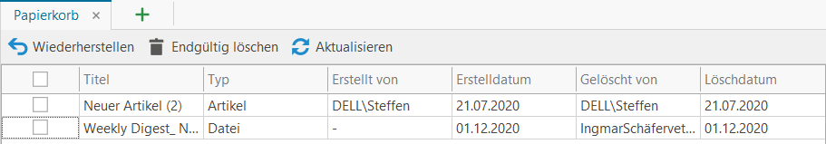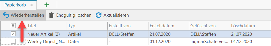 Um Inhalte aus dem Papierkorb wiederherzustellen, wählen Sie den oder die entsprechenden Einträge aus und klicken Sie auf "Wiederherstellen", z.B.