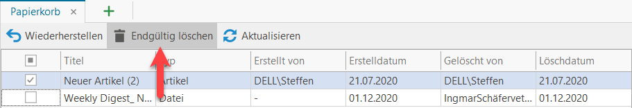Um Inhalte eines Wissensgebiets tatsächlich zu löschen, müssen diese aus dem Papierkorb entfernt werden. Wählen Sie hierzu einen oder mehrere Einträge in der Liste aus und klicken Sie auf "Endgültig löschen" z.B.