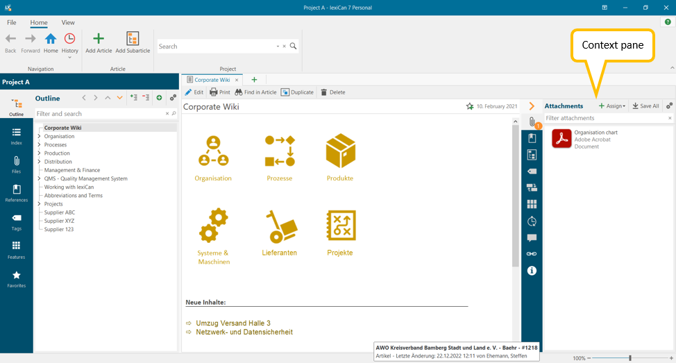 lexiCan allows you to link articles. In this section of the context area you will find all articles that are linked to in the current article ("Outgoing"). Accordingly, under "Incoming" you will find all articles that link to the current article.