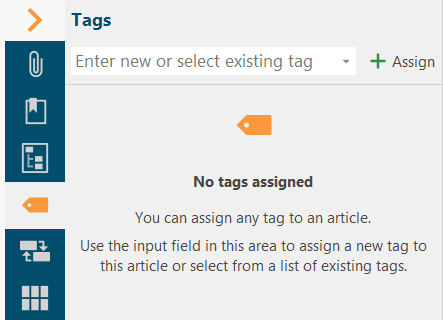 Here you can assign already created or new tags to an article, a reference or a file, via which the content can be found by means of a Full-text Search, e.g.