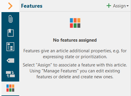 You can assign self-defined features to articles, Files and References, e.g. to better filter search results or to mark contents in the Outline and the Index.