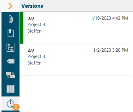 The section lists the different (pre-)versions of an article, provided this function has been activated for project. If it is not activated, the section is not displayed. The entry with the green bar marks the most recent version, e.g.