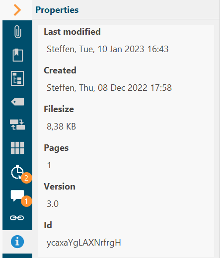 Here you will find the metadata of an article, file or reference, such as the creator or the date of creation. The field "Identifier" (only for articles) has only technical significance and may be needed for support cases. The identifier of an article cannot be changed.