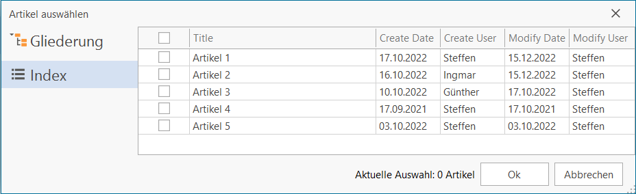 If you like to export only parts of the project ("Selection"), a selection window opens after starting the export process, in which you can choose between the index view and the outline view (translation outstanding), e.g.