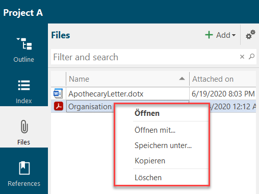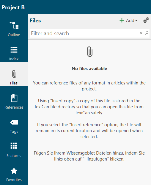 lexiCan allows you to attach files to articles and references. These files are listed in the navigation under "Files".