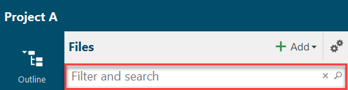 Entries in the search and filter field first filter the entries and reduce the display to those files whose names contain the characters entered. If you also click on the magnifying glass symbol, a full text search of the entire project is started.