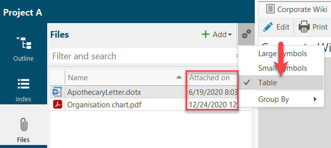 If you select "Table", additional columns are displayed, such as the date on which a file was inserted.