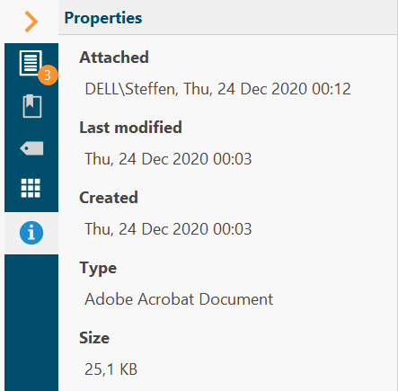In the associated context area on the right-hand side of the screen, you can see the existing assignments of the file to articles, references and keywords as well as assigned features. It is possible to change these assignments directly here. Under "Details" you will find the metadata of the file, e.g.