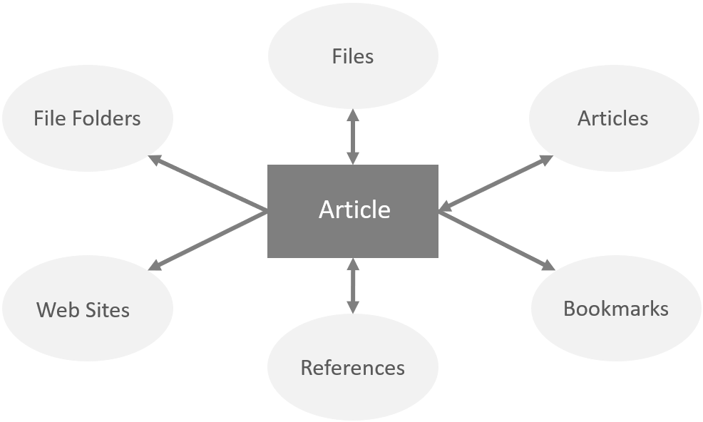 The central element in a wiki system like lexiCan is the article. However, it does not have to stand alone in lexiCan, but can be linked to other articles, files, references, file folders and web addresses. The following diagram tries to illustrate this. An arrow means that links can lead to other articles, files, web pages, etc. A double arrow means that the respective content always and automatically includes a link back to the corresponding article. In this way, the Context Pane of an article, a reference or a file always shows in which articles it is used.