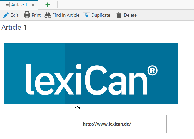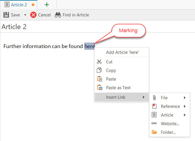 Without prior definitions, lexiCan uses the designation of the target when inserting links, e.g. the name of the file or the article to be linked. If you want to determine yourself which text should carry a link, mark it with the mouse before setting the respective link, e.g.