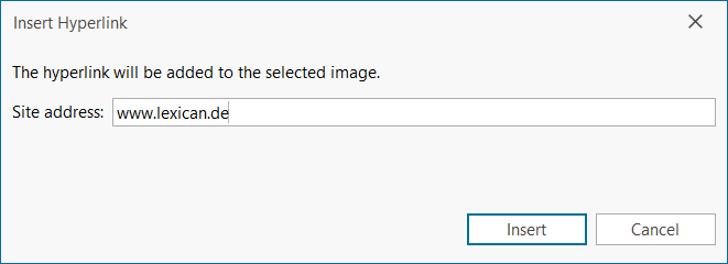 Links can also be set to images in lexiCan. The procedure is the same as for text with one small difference. In this case, the context menu (right mouse button) is not available and the menu bar "Insert" must be used. The procedure is as follows: