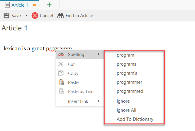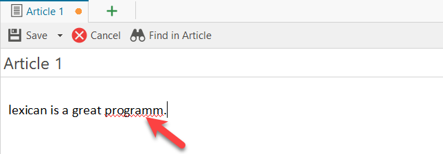 If the spell checker is activated for the open knowledge area, unknown words or spelling mistakes are recognized and marked with a red wavy line.