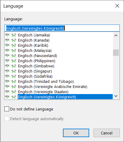 In the dialog box, select the underlying language (dictionaries are available for languages marked with ABC and a tick), e.g.