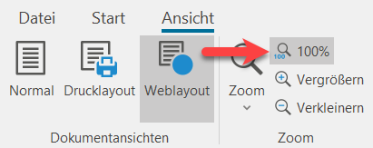 Die Ansicht "Weblayout" arbeitet ähnlich wie die Ansicht "Normal" kennt aber in der Breite keine Begrenzung und nutzt ähnlich einem Browser den kompletten, zur Verfügung Platz. Anwender, die den Webclient zur Veröffentlichung nutzen, sollten diese Ansicht wählen. Z.B.