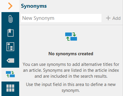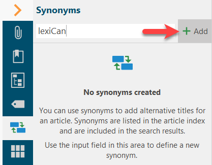 Articles have a title, i.e. a designation under which they are listed in the Index and the Outline. lexiCan offers the possibility of defining additional synonyms, i.e. alternative designations for articles, via the Context Pane. These are then also listed in the index (not in the outline) for the article. The Full-text Search also takes synonymous article names into account.
