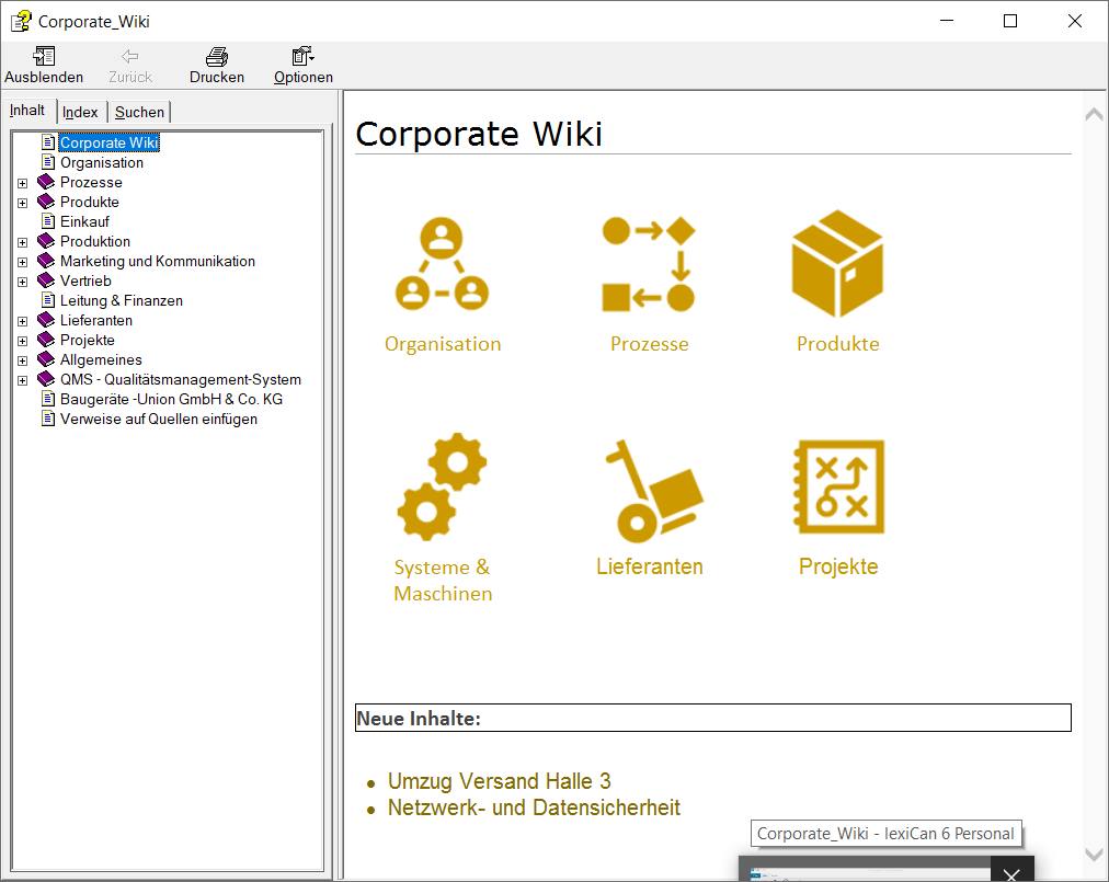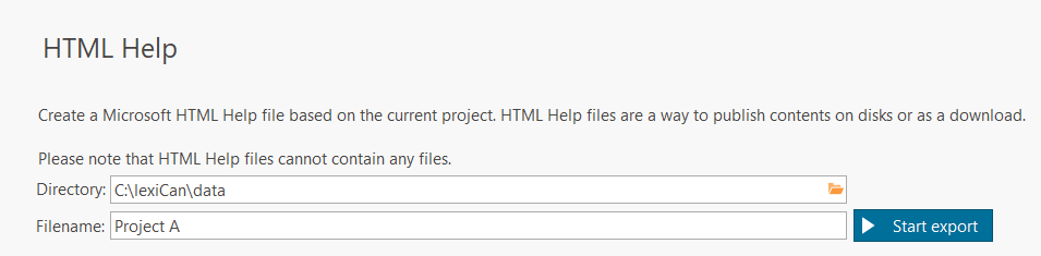 HTML Help is a format on which the help files of many Windows programs were based in the past. It is somewhat outdated, but continues to be appreciated by some users. With lexiCan you have the possibility to create an HTML Help file from any project. Unfortunately, this export variant cannot take into account the files contained in a project. The CHM file format does not allow this.