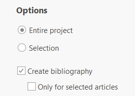 In the "Options" area, determine whether you want to export the entire project or only parts of it ("Selection"). You can also specify whether you want to export the references assigned to articles as well.