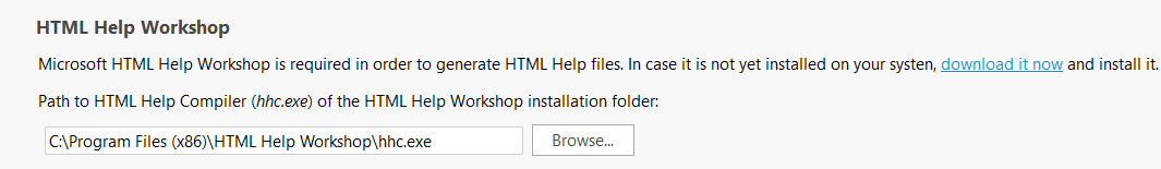 If the HTML Help Workshop (see above) was not installed to C:\Program Files (x86) by default, you must enter the exact program path in the following area. If the program is not installed yet click on the link within the text.