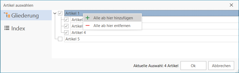 If you only like to export just parts of the project ("Selection"), a selection window opens after starting the export process, in which you can choose between the index view and the outline view (translation outstanding), e.g.