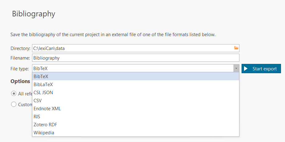 In the "Options" area you can decide whether you want to export all references or only parts of them.