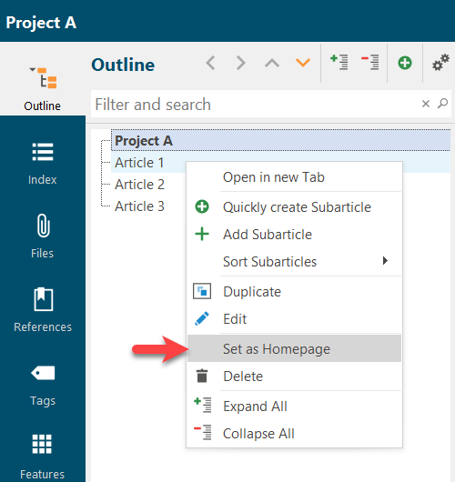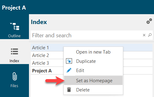 To define an article as a start page, use the context menu via the right mouse button in the Index or the Outline.