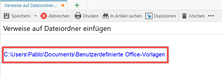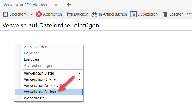 Nehmen Sie den betreffenden Artikel in Bearbeitung, setzen Sie den Cursor an die Stelle im Artikel, an welcher der Verweis eingefügt werden soll oder markieren Sie die Textstelle, die den Verweis tragen soll. Klicken Sie anschließend in der Funktionsleiste "Einfügen" auf "Ordner".