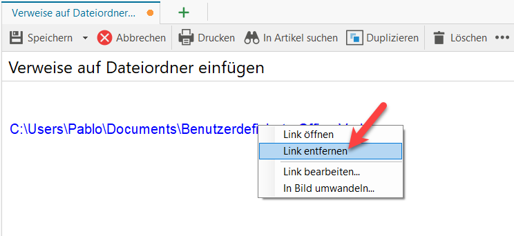 Um den Verweis auf einen Ordner zu bearbeiten , empfehlen wir diesen zu löschen und einen neuen Verweis einzufügen. Zum Löschen nehmen Sie den Artikel in Bearbeitung und klicken Sie im Pull-down-Menü (rechte Maustaste) auf "Link entfernen".