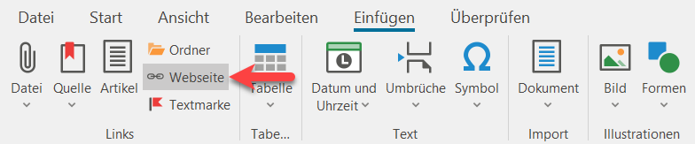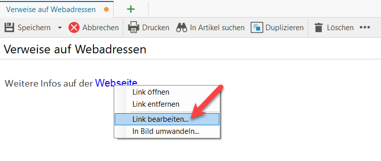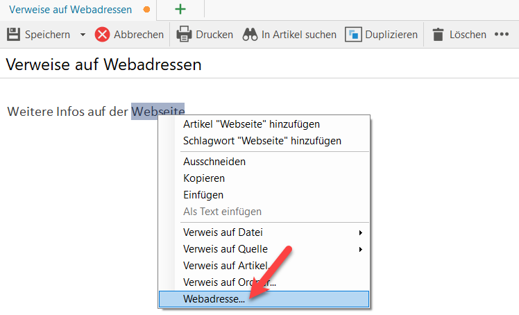 Nehmen Sie den betreffenden Artikel in Bearbeitung. Setzen Sie anschließend den Cursor an die Stelle, an welcher der Verweis erscheinen soll oder markieren Sie den Text für den Verweis. Klicken Sie in der Funktionsleiste "Einfügen" auf "Webadresse".