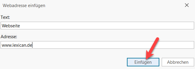 lexiCan öffnet daraufhin ein Dialogfenster, in dem Sie den Text als auch die URL-Adresse des Verweises definieren können, z.B.