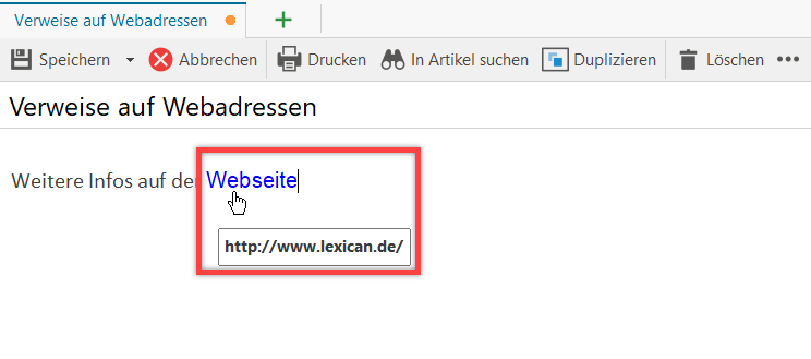 Das Internet oder das Web als Informationsquelle ist nicht mehr wegzudenken und viele Informationen unterliegen ständigen Änderungen. Da macht es Sinn auf Inhalte und Seiten im Internet zu verweisen. Diese ist mittlerweile gängige Praxis steht natürlich auch in lexiCan zur Verfügung.