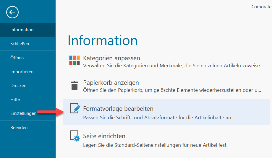 Zum Verwalten der Formatvorlagen eines Wissensgebiets öffnen Sie das Hauptmenü und "Informationen" und klicken dort auf "Formatvorlage bearbeiten".