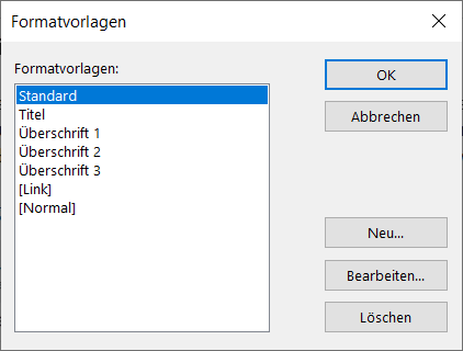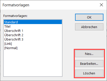 Über die Schaltflächen rechts können Sie bestehende Vorlagen bearbeiten, neue Vorlagen erstellen und unerwünschte löschen. Änderungen wirken sich direkt auf alle Texte aus, deren Format über die jeweilige Vorlage definiert ist.